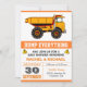 Amaze your guests with this cool construction theme baby shower invite featuring a dump truck and cute construction elements with modern typography on a white background. Simply add your event details on this easy-to-use template to make it a one-of-a-kind invitation. Flip the card over to reveal a vibrant yellow and black stripes pattern on the back of the card.