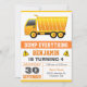 Amaze your guests with this cool construction theme birthday party invite featuring a yellow dump truck with modern typography against a white background. Simply add your event details on this easy-to-use template to make it a one-of-a-kind invitation. Flip the card over to reveal a vibrant yellow and black stripes pattern on the back of the card.