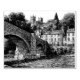 A finely detailed black and white sketch of Dunkeld, the historic town in Perthshire, Scotland. Illustrated in a vintage engraving style with intricate pen-and-ink linework, this artwork shows the River Tay flowing under the arched stone bridge, with Dunkeld Cathedral set among trees on the riverbank and Georgian stone houses nearby. A timeless design for lovers of Scotland, Highland towns, and classic heritage art.