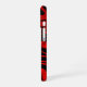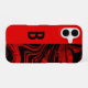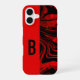 Cell phone case has a solid block of red on one side and a swirl pattern in red and black on the other side. Personalize with an initial, name or other text for a great gift idea. The name is in vertical orientation in black lettering.