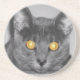 A photograph looking straight in the face of a grey cat with golden glowing eyes. Edited with selective colouring to emphasize the mesmerizing eyes.