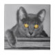 A photograph looking straight in the face of a grey cat with golden glowing eyes. Edited with selective colouring to emphasize the mesmerizing eyes.