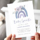 These adorable baby sprinkle invitations feature trendy boho style and trendy handwritten script. A dusty blue and purple cute painted rainbow is decorated with matching watercolor flowers on a simple white background.