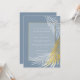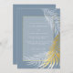 This invitation has both elegance and the wow factor. This design features a dusty blue background, gold and white palm fronds, and classic typography.