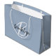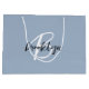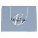 This personalized gift bag features a monogram and first name in modern black and white script on a trendy dusty blue background, with the additional text in black sans serif font below.