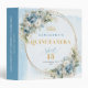 Celebra un momento inolvidable con este álbum de recuerdos personalizado para Quinceañera / 15 años, diseñado en un delicado estilo boho o bohemio. La combinación de tonos azul polvo, azul pastel y azul claro, junto con flores suaves, eucalipto y follaje verde, crea una estética elegante y moderna, realzada con detalles en dorado que aportan un toque de lujo y distinción.