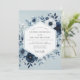 Delicate floral elements in deep blues and soft whites intertwine with lush green foliage. This design evokes a serene and romantic mood, perfect for a sophisticated celebration. The artwork features anemone-like blooms and textured leaves.