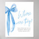 Add a touch of elegance and fun to your bridal shower with our Dusty Blue Bow Bridal Where Were They Sign. Featuring a beautiful dusty blue bow design, this sign is perfect for a "Where Were They" game, where guests guess significant locations in the couple's relationship. The sophisticated design and soft hues make it a charming addition to your event decor. Printed on high-quality material, this sign is both stylish and durable, ensuring it will be a lovely keepsake for the bride-to-be.