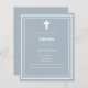 Dusty blue background, decorated with a white frame, and a white cross Personalize and add the name and details. White text.