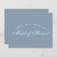 It is just white text on dusty blue background (a modern colour, popular for the bridesmaid dresses). The words Maid of Honour on the front and the message on the back are written in an elegant calligraphic script, the arched text "[Name] will you be my" above in small caps.