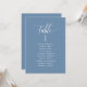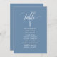 Aidez vos invités à trouver leur table avec cette élégante carte moderne de plan de salon avec les noms des invités. Cartes recto-verso pour que les clients puissent chercher leur nom à l'avant ou à l'arrière. Libérez de l'espace tout autour en vous donnant la liberté d'utiliser des clips ou un trou de perforation pour accrocher des écrans, ou d'utiliser le support/cadre de table. Arrière - plan bleu Dusty et texte blanc. Détails de calligraphie manuscrite moderne. Plusieurs options de couleur. Ayez tous les numéros de table dans la même couleur ou mélangez les couleurs selon le thème de couleur de votre événement. Une partie de notre collection "Berry, Blue and Burgundy Floral".