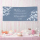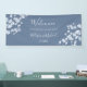 Wedding welcome reception seating chart with blue white cherry blossoms on a dusty blue background. A welcome text and your bride and groom names in an elegant handwritten font.