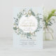 This elegant first holy communion invitation features a light dusty blue background with a wreath of cotton flowers, blue green foliages / leaves / greeneries, and faux gold berries. The reverse side features a dusty blue background with honeycomb patterns. Change the background colour and personalize it for your needs. You can find matching products at my store.