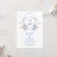 A refined and romantic wedding design featuring a dusty blue monogram crest framed by watercolor florals in pastel lavender, blush, and peach tones. The layout includes soft greenery, elegant serif and script typography, and a timeless format perfect for formal weddings.