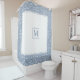 Dusty blue and white damask pattern and white square with monogram shower curtain. It showcases a dusty blue and white damask pattern and a white square in the centre with your monogram and scalloped borders. You can personalize it with your family name and monogram.