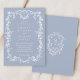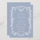 Elegant blue floral frame wedding invitation with a floral crest and monograms on the back.
