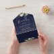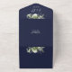 All in one navy blue postponed wedding invitation featuring botanical greenery rustic leaves falling across a gold arch enclosing elegant typography. The invitation includes a perforated RSVP card with your wedding website QR code. Designed by Thisisnotme©