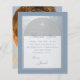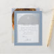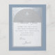 A modern first communion invitation. On a dusty blue rectangular background, it has a faux silver foil arch that has inside dusty blue text on white background. The words "Thank you" and the name are written in an elegant calligraphic script; the rest in caps.