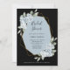 This simple and elegant wedding bridal shower invitation features romantic watercolor eucalyptus leaves and dusty blue roses and hydrangea flowers on a faux gold geometric centre frame and a dark, black background.