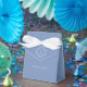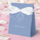 Stylish and chic french style wedding favour boxes. This memorable design features monogrammed couple initials in a lovely set of contemporary fonts inside a delicate white floral frame, against a dusty blue background.