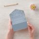 All-in-one greenery floral wedding invitation featuring elegant hearts script typography and monogram initials on a dusty blue background. The invitation includes a perforated RSVP card that features your wedding website QR code. Designed by Thisisnotme©
