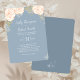 Celebrate your dusty blue wedding with this elegant invitation featuring delicate blush pink floral accents and soft watercolor details. Designed with graceful calligraphy script, lush botanical greenery foliage, and a balance of classic charm and modern typography, this template blends timeless romance with contemporary style. Perfect for couples seeking a sophisticated yet fresh design, it sets the perfect tone for an unforgettable celebration filled with love and elegance.