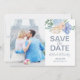 This dusty blue florals photo save the date card is perfect for a spring or summer wedding. The dainty design features light blue peonies arranged with peach and cream flowers in a gorgeous bouquet. Personalize the card with your engagement photo, names, wedding date and location.