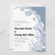 Dusty blue and white flowers in vintage style and typography floral wedding invitation, displaying a vintage dusty blue and white floral border on white background.