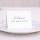 Elegant folded wedding place card in a refined dusty blue French style. This minimalist tent card features a delicate script “Welcome” paired with a classic serif name layout, creating a timeless and sophisticated table setting.