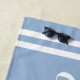 Personalized beach towel design for a girls' weekend vacation getaway features a custom first name in modern script writing framed by coastal stripes, with custom text for the occasion. The dusty grey blue background colour can be modified. Please visit our shop for other colour options.