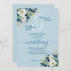 An elegant wedding invitation with dusty blue and gold glitter flowers and elegant calligraphy that you can customize with your details.