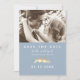 Announce your wedding date in an elegant and meaningful way with this dusty blue photo save the date card, featuring a soft romantic design with delicate gold lovebirds.