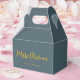 Surprise your holiday party guests with these Dusty Blue Gold Merry Christmas Script Custom Favour Boxes. This simple and elegant design has the customizable greeting "Merry Christmas" in faux gold trendy hand script lettering on the middle front of box. The background is dusty blue and you can change to any colour. Personalized with family name or your custom text in simple print lettering.