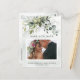 Design features a bouquet of watercolor greenery, eucalyptus and a succulent over a dusty blue watercolor splash. Design also features specks of painted (printed) gold and green. Change the demo couple's photo to your very own. View the collection link on this page to see all of the matching items in this beautiful design.