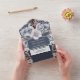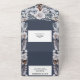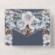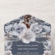 A beautiful all-in-one woodland watercolor invitation featuring pretty dusty blue grey rose flowers; cappuccino coloured pine cones, dark orange berries and ivory silver leaf foliage branches set against a slate background. The bottom third has a tear off response card with personalized rsvp address for your guests to complete. These are ideal for winter, rustic country or fall celebrations as well as woodland forest theme parties.