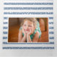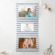Dusty blue joy and berries Christmas holiday trifold photo card. The cover showcases the word "JOY" with red berries and greenery while instead of the letter "O" there is your photo. The inside first and last panels as well as the ourside flap feature a pattern of dusty blue and white stripes and snow that form frames for your photos. The inside middle panel displays a frame with your wishes accented with red berries and greenery. Some photos are of Photography © Storytree Studios, Stanford, CA