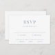 La carte RSVP mariage moderne et élégante présente un design horizontal minimaliste bleu et blanc poussiéreux. Personnalisez avec vos choix de repas et la date limite RSVP avec le modèle facile à modifier avec une police de script élégante et une police serif classe. Découvrez les objets correspondants dans la collection "Dusty Blue Modern Elegant".