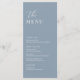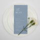 Modern, elegant menu features a minimalist dusty blue and white design. Personalize with your event's menu with the easy to edit template featuring an elegant script font and classy serif font.