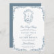 Dusty Blue Monogram Floral Vintage Crest One Day Away Invitation Card. Celebrate your special day with this elegant and beautiful wedding invitation card to beautify your special occasion. All the texts are pre-arranged for you to personalize easily and quickly with your own details. If you need further customization or matching items, please email alldaybreakfastzazzle@gmail.com – we would love to help.