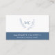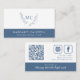 Dusty Blue Monogram Wreath with Slogan Business Card... The front of our unique business card features an elegant botanical wreath bordering your two monogram initials in dusty blue ink on a white background. Your name and title (or company name) appear in white ink on a dusty blue rectangle bordering the bottom of the business card, giving an authoritative structure to balance the delicate leafy wreath. On back of the card are your phone number, social media contact info, website address and QR code linking to additional information. The dusty blue section on bottom contains your business motto or tagline. Example text currently shows "Always take the high road" in white script typography. If you prefer, you can delete the text for the motto. All text and the QR code can be easily revised on the personalization template.