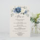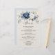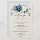 Dusty blue floral wedding menu featuring elegant bouquet of navy blue, royal blue , white , gold, champagne ivory, blush colour rose , ranunculus flower buds and sage green eucalyptus leaves and elegant watercolor bouquet. Please contact me for any help in customization or if you need any other product with this design.