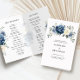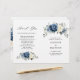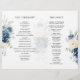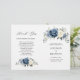 Dusty blue floral folded wedding program featuring elegant bouquet of navy blue, royal blue , white , gold, champagne ivory, blush colour rose , ranunculus flower buds and sage green eucalyptus leaves and elegant watercolor bouquet. Please contact me for any help in customization or if you need any other product with this design.