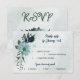 Unique wedding response card RSVP with meal choice featuring romantic dusty blue and navy flowers and green leaves.
