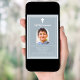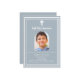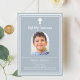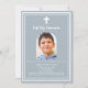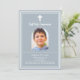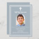 Dusty blue background, decorated with a white frame, and a white cross Personalize and add a photo name and details. White text. Arch shaped photo frame.