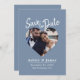 Dusty blue photo modern script save the date card featuring a centered heart-shaped photo, soft dusty blue background, and white script headline. This design highlights your engagement photo while clearly presenting names, date, and location in a clean, balanced layout that feels both modern and timeless. Ideal for weddings, destination celebrations, vow renewals, or formal engagements where a classic printed announcement is preferred. Easily personalize with your details.