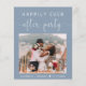 Budget-friendly dusty blue elopement / private wedding announcement and reception invitation featuring your photo, "Happily Ever After Party" in simple white typography and a chic white script with swashes and your names and wedding date. On the back, input your wedding website URL address to create a QR code for guests to scan for all the details and to RSVP online, personalize your announcement and reception details and add your names in a signature-like white script.