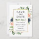 Modern Watercolor Eucalyptus Greenery Dusty Blue Pink Blush Floral Gold Frame Save The Date Engagement Announcement Card