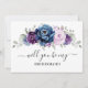 Elegant dusty blue Purple lilac lavender floral theme will you be my bridesmaid invitation featuring elegant bouquet of dusty blue, Navy, purple, lilac colour rose flowers buds and sage green eucalyptus leaves. Please contact me for any help in customization or if you need any other product with this design.