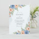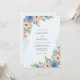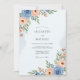 This design features a serene watercolor palette of dusty blue and soft peach. Hand-painted roses and delicate ranunculus blooms are paired with eucalyptus leaves decorating the composition. The airy aesthetic creates a romantic atmosphere perfect for a seasonal spring ceremony. Light blue washes add depth to the background for a cohesive botanical look.
