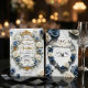 Invite your guests to a "happily ever after" event with this enchanting design that captures the magic of true love. Featuring graceful swans and lush floral details, this aesthetic perfectly sets the tone for a formal spring ceremony or a sophisticated winter celebration. The romantic imagery serves as a beautiful keepsake for friends and family long after the big day.A digital illustration featuring a faux gold baroque oval frame centered on a clean white marble background. Two white swans face each other at the bottom, creating a subtle heart shape with their curved necks. A lush wreath of watercolor dusty blue and white roses, accented with sage and eucalyptus greenery, surrounds the metallic-effect frame. Inside the oval, a black silhouette depicts a groom kneeling to propose to a bride, flanked by customizable monogram initials in circles. The event details are typeset in a mix of deep navy blue serif fonts and elegant gold-tone calligraphy script. Please note that all gold and marble textures are flat printed ink, not real foil or stone.